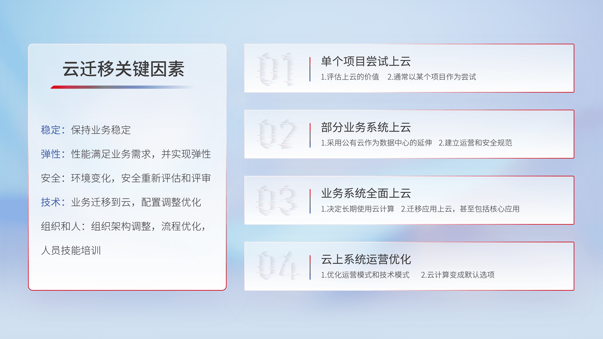 结合实际业务,,,,从规划设计、、、、云平台选型、、云原生改造、、、数据迁移、、、、集成交付,,迁移全过程为客户识别最佳上云路径,,做好风险识别管理,,,,设计网络架构、、身份权限、、、、安全审计合规、、、、操作审计、、、日志审计、、监控告警策略、、、多站点容灾设计等,,,,对云上基础设施进行整体规划,,提升IT治理水平,,以满足弹性、、、、高可用、、高性能的需求。。。